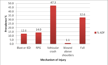 As can be seen in Figure 1, the most common mechanism of injury in the ADF were vehicular crashes (47.3% N=23685). Over their lifetime, 32.6% (N=16321) of the ADF reported having a fall, 14%